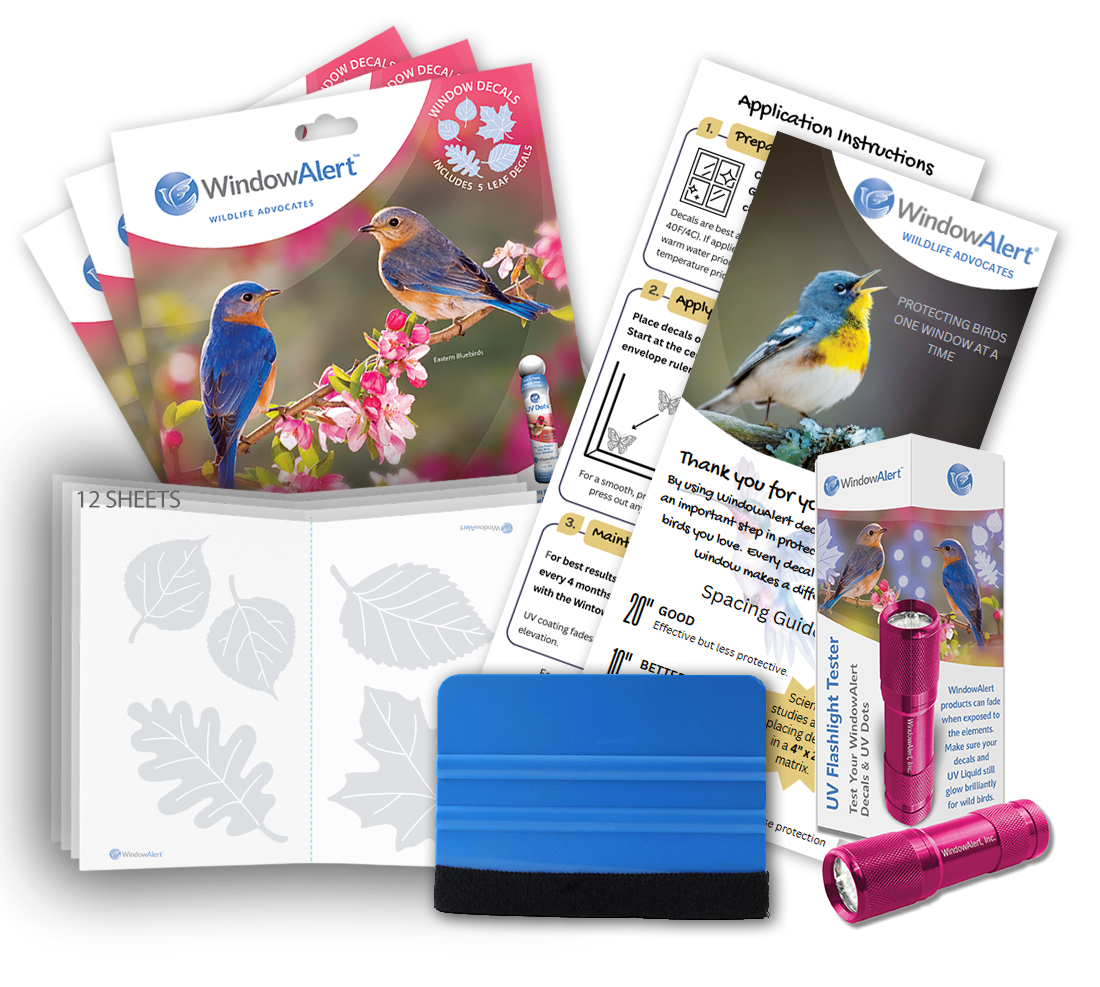 Introducing the WINDOWALERT starter pack - Perfect for first timers looking to get started with protecting birds from windows. Each pack contains 12 sheets, application instructions, a UV tester flashlight, and an application squeegee.